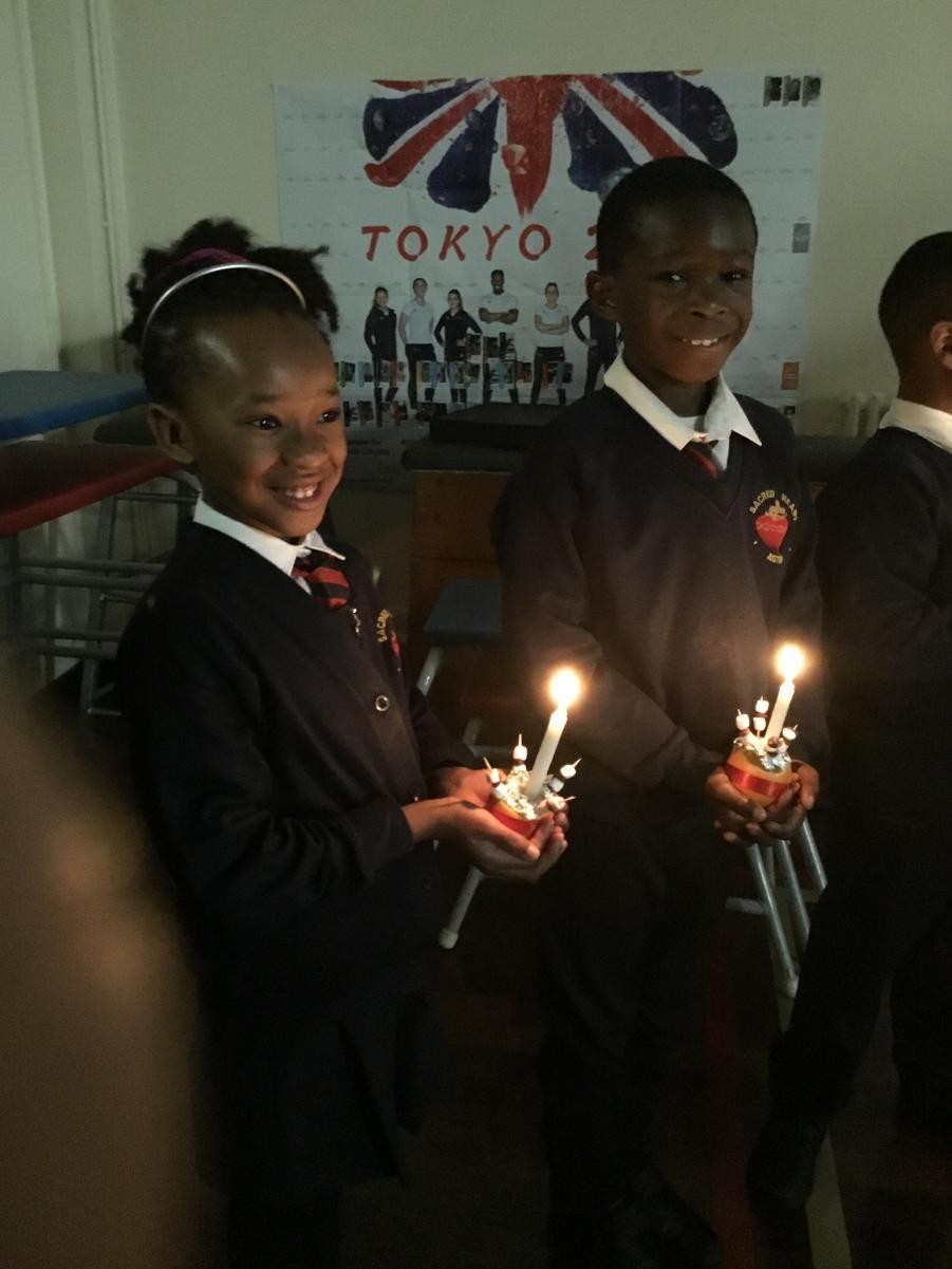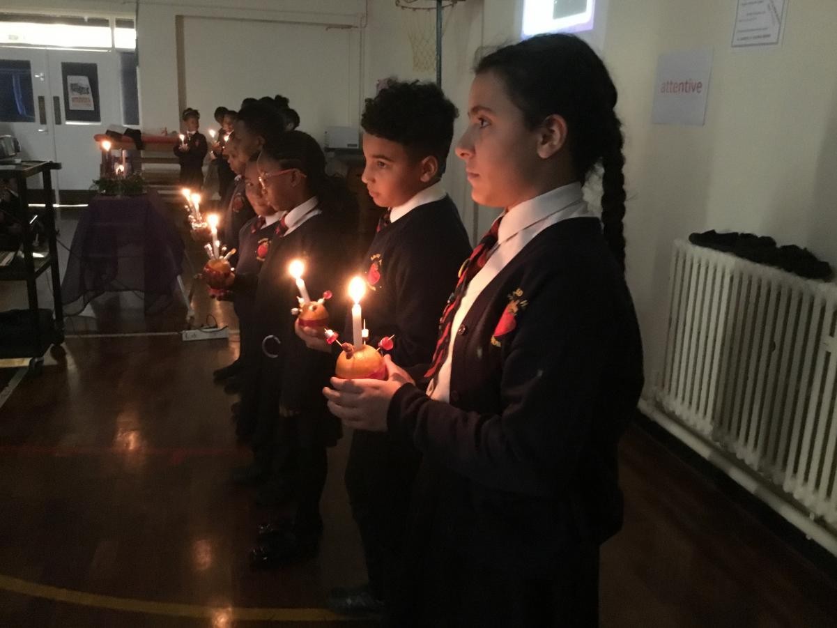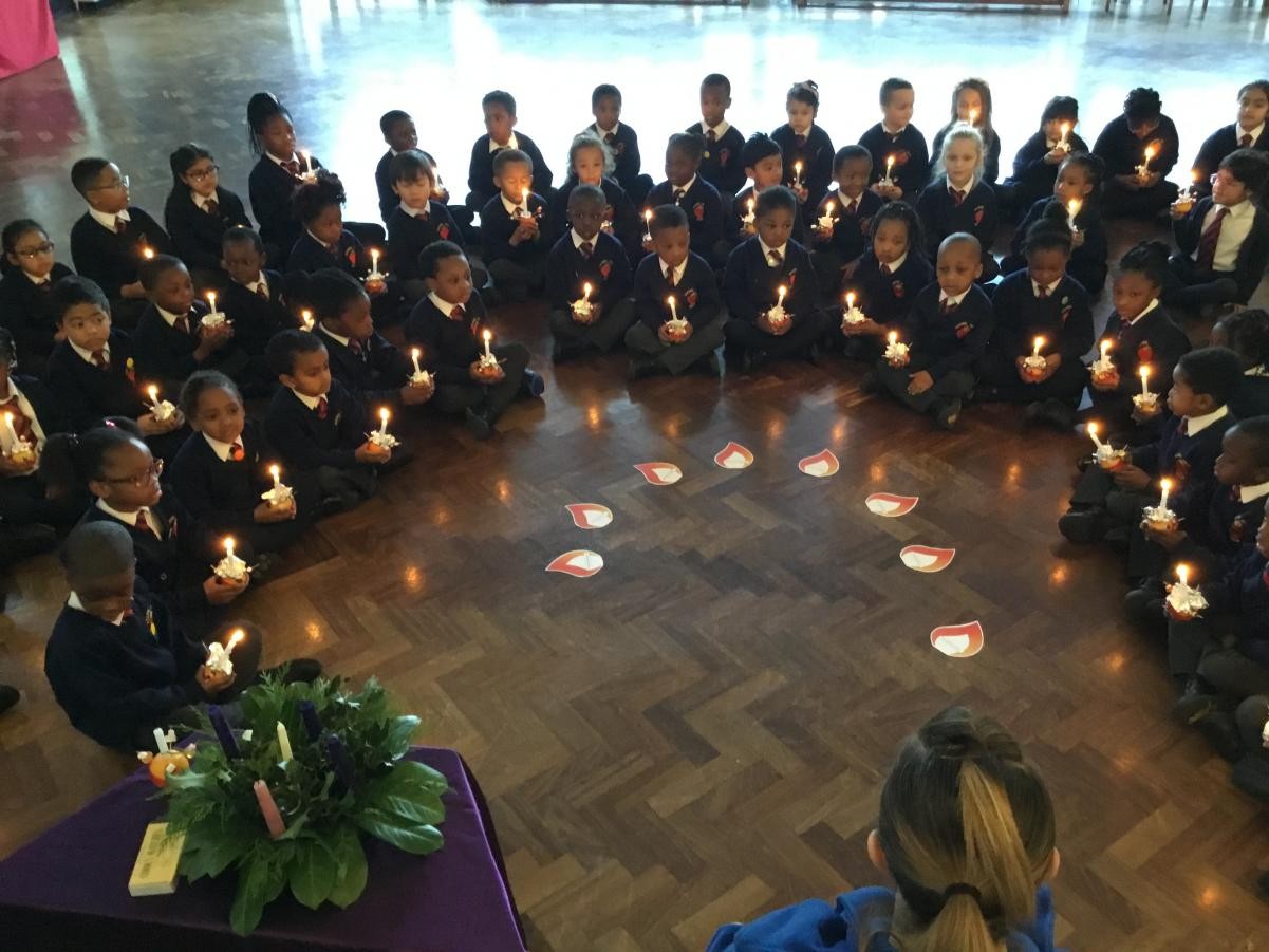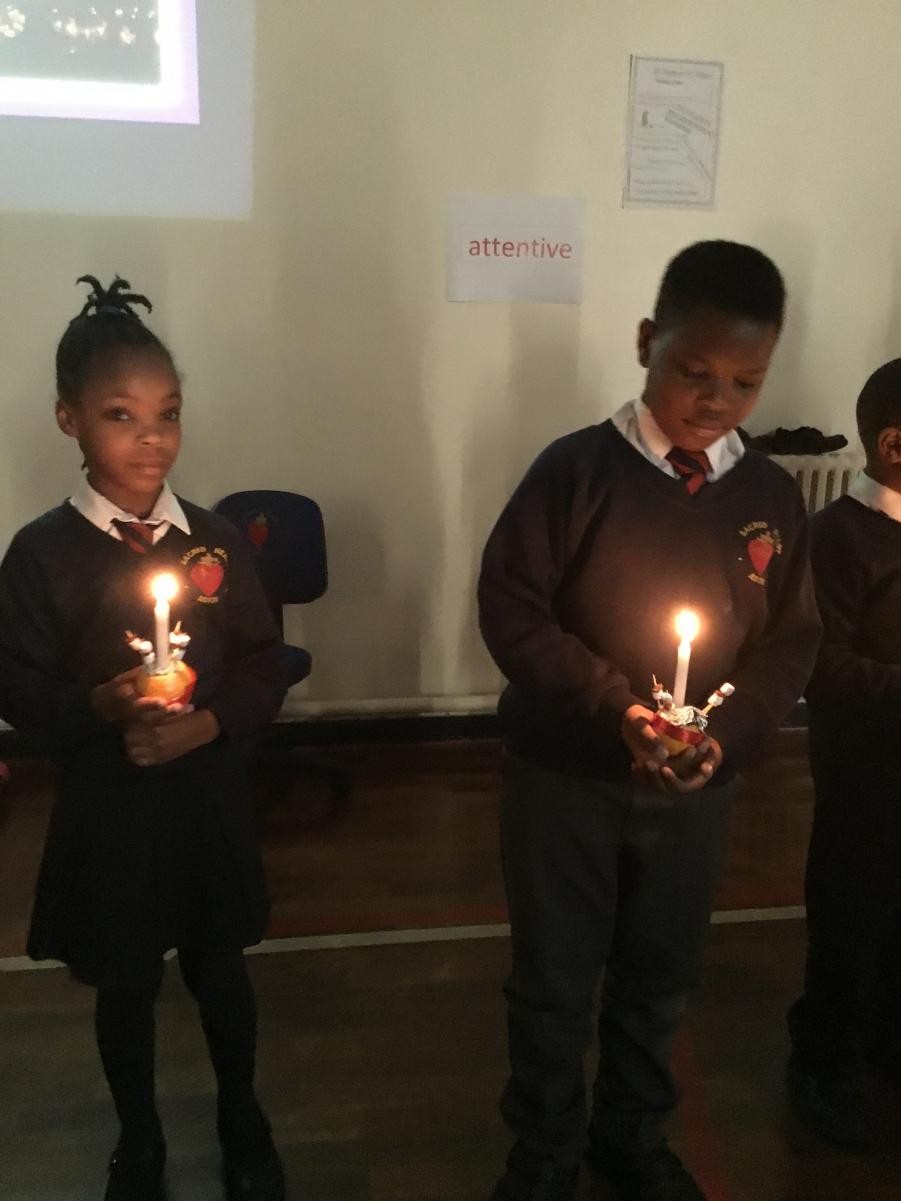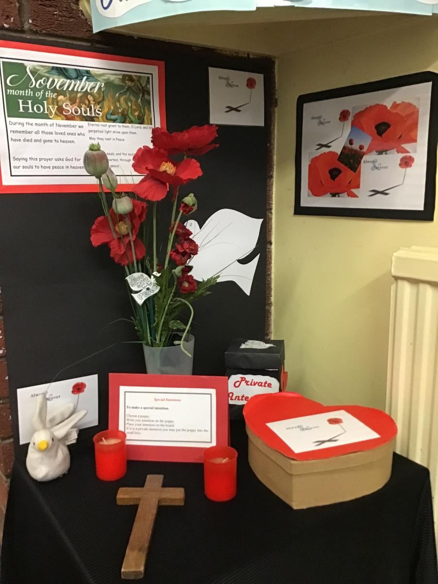 KS1 and KS2 gathered together to celebrate the month of Holy Souls and Remembrance Sunday. The children gathered around the hall so they could focus on the candles in the centre and the large poppy they contributed to.