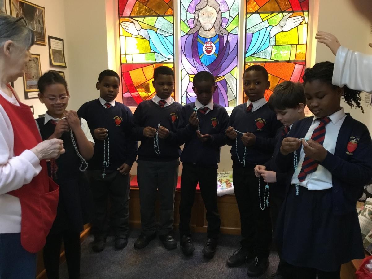 Mrs McKernan and the children preparing for the Sacrament of The Eucharist pray the Rosary every week by our beautiful Sacred Heart window.
